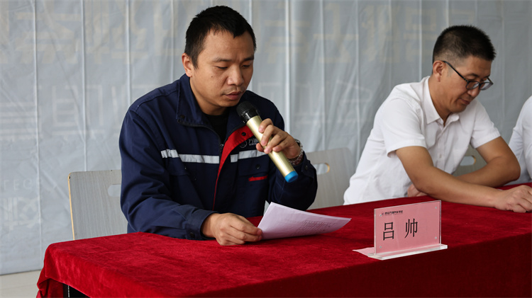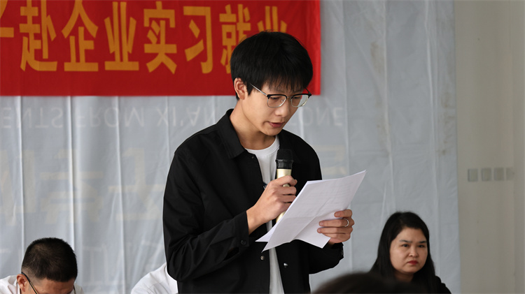 随后,学生代表胡木林森(新能源2302班)上台发言。他表达了对学校与企业提供实习机会的感激之情,并代表全体实习生郑重承诺:将以“空杯心态”投入学习,严守企业纪律,注重团队协作,用实际行动展现万通学子的专业素养与精神风貌。他的发言真挚有力,道出了同学们共同的心声与对未来的坚定信念。