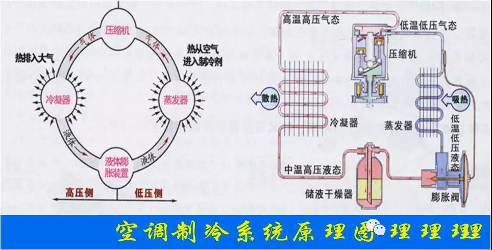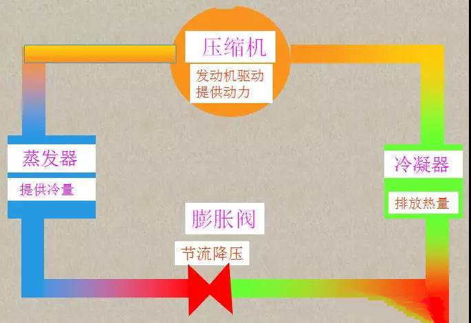 高压液体经过节流(膨胀阀)降压降温流入蒸发器,并在相应的压力下蒸发,吸取周围热量,同时车内侧风扇使车内空气不断进入蒸发器的翅片间进行热交换,并将放热后变冷的气体送向车内。如此室内外空气不断循环流动,达到降低温度的目的。