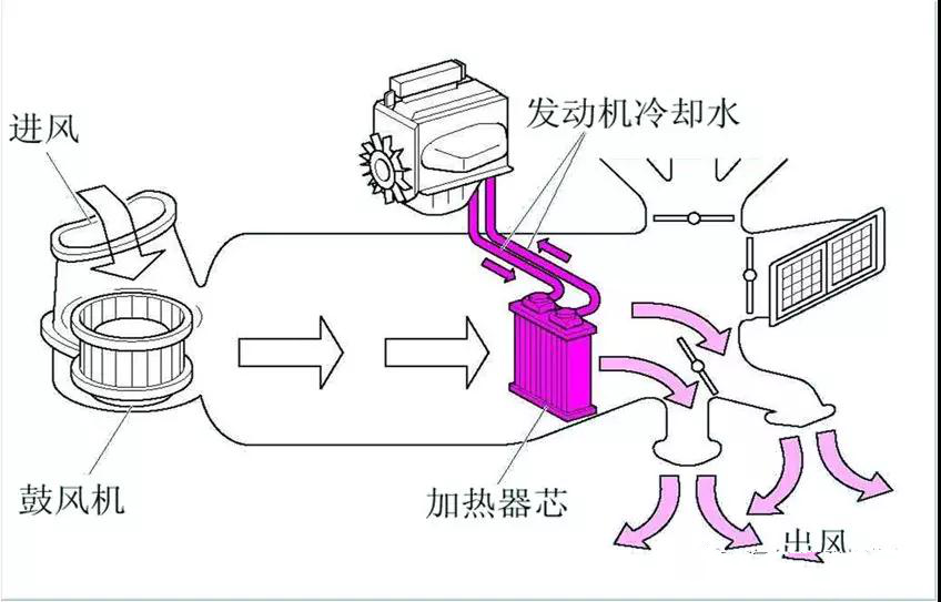 工作原理:在汽车空调的制热系统中,热量并非是由空调系统产生的,而是由发动机冷却液产生的。