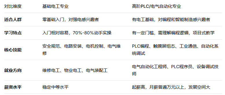 对于刚入门的人来说,基础电工和高阶PLC容易混淆。以下对比可以帮助你更清晰地选择方向: