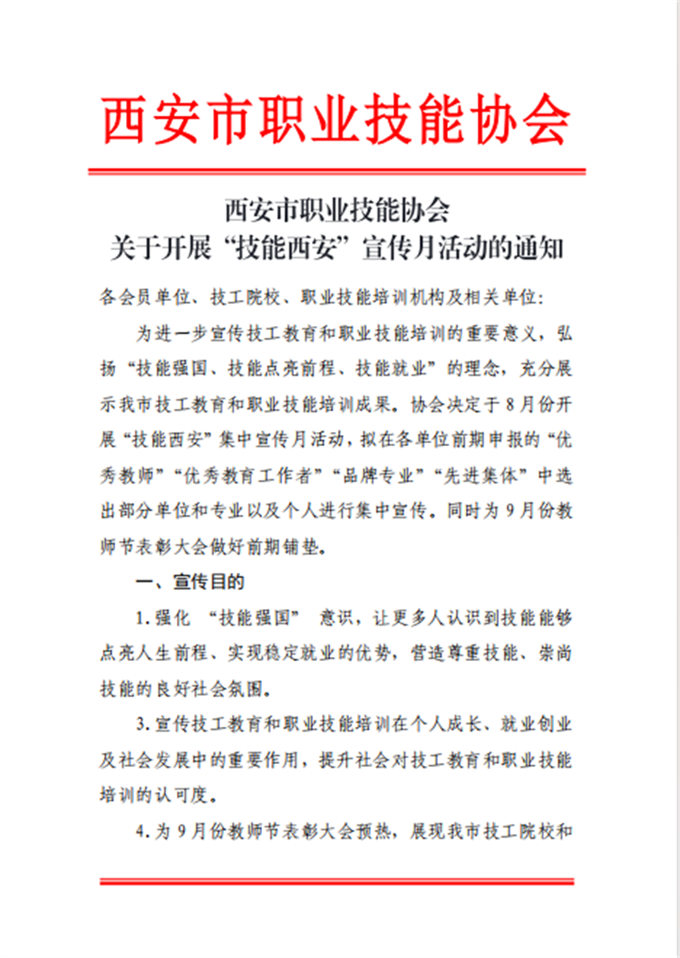 西安市职业技能协会发布了《关于开展“技能西安”宣传月活动的通知》,旨在进一步弘扬“技能强国、技能点亮前程、技能就业”的理念,展示我市技工教育与职业技能培训的丰硕成果。