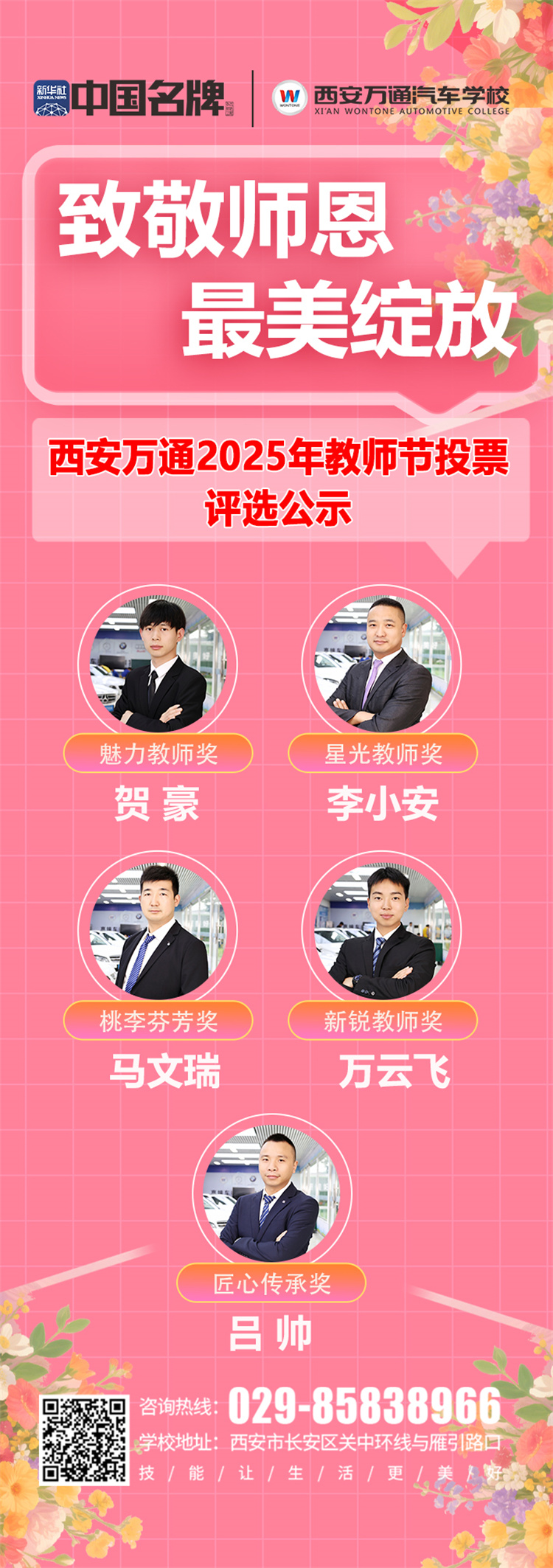 一句祝福,感恩一路相伴 “一支粉笔写春秋,三尺讲台系国运。”教师的职业从来不是简单的“教书”,而是用自己的光,照亮学生前行的路。 今天,让我们郑重道一声:西安万通全体老师,教师节快乐!感谢你们以匠心育匠人,以初心筑梦想,感谢你们在实训台旁的每一次示范,在作业本上的每一笔批注,在成长路上的每一次鼓励。 让我们向所有默默耕耘的教育工作者致敬! 愿岁月温柔以待, 愿老师们桃李芬芳!